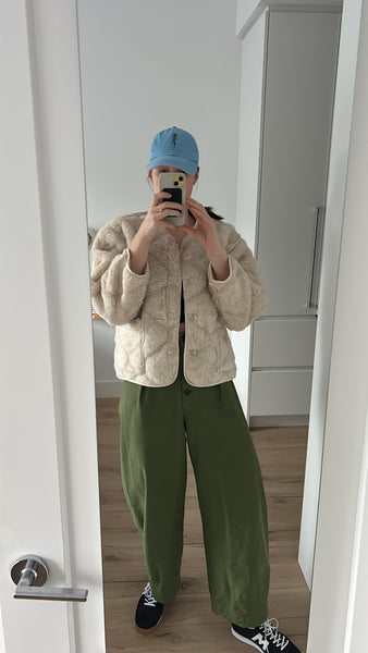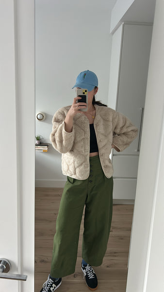 Oversized wool jacket in a boxy cut with a lowered shoulder line. It has a comfortable button closure and pockets, finished with cream piping.